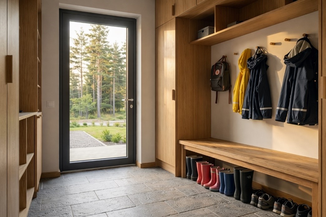 Грязевая комната при входе (там можно снять грязную обувь и верхнюю одежду), отдельная постирочная, кладовки — все это позволяет поддерживать порядок в доме, даже когда в нем живут активные дети.