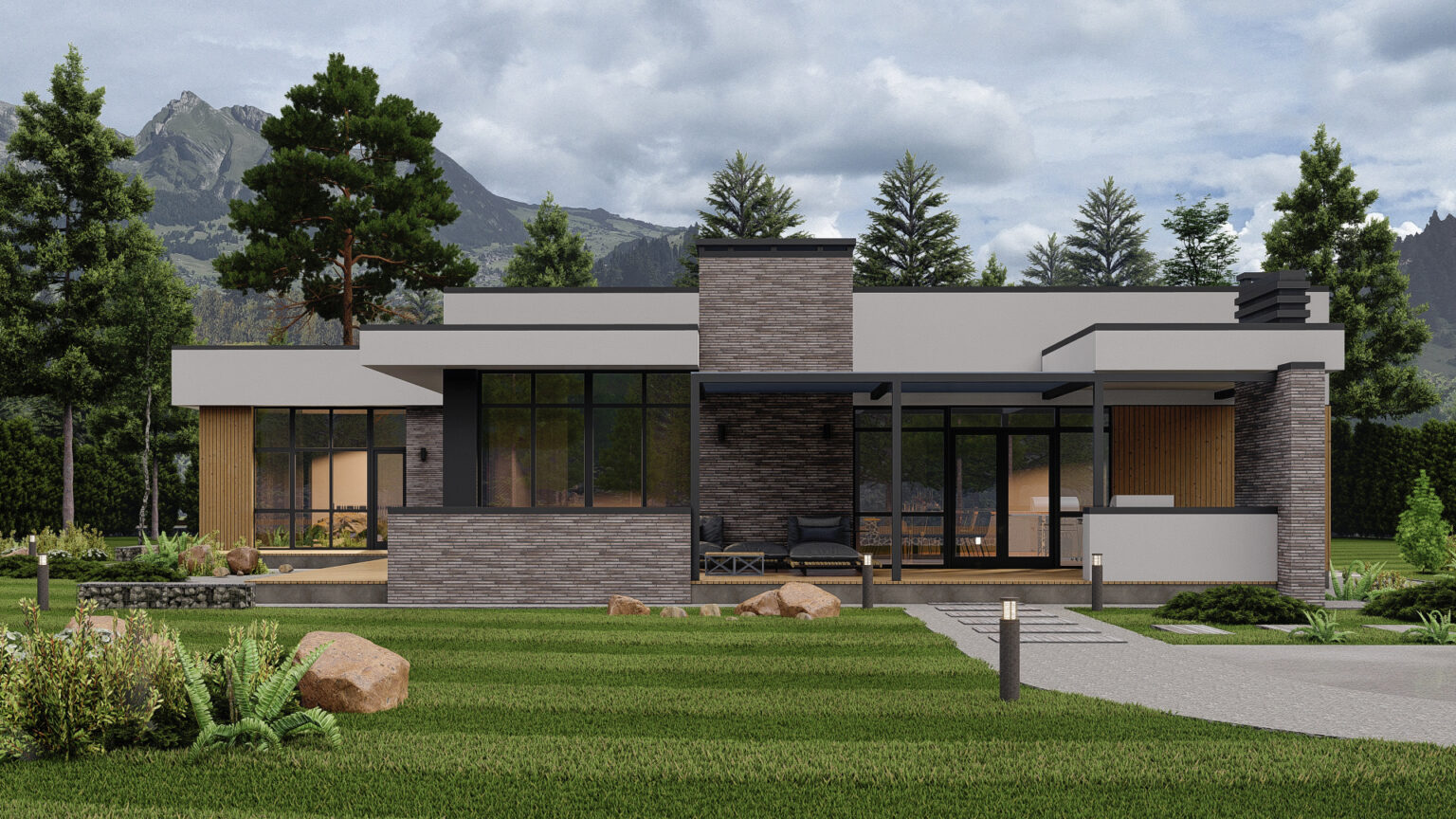 - Современная эстетика: Лаконичные формы, большие окна, деревянные акценты на фасаде и плоская кровля создают образ дома, который будет актуален десятилетиями и станет предметом гордости владельцев.